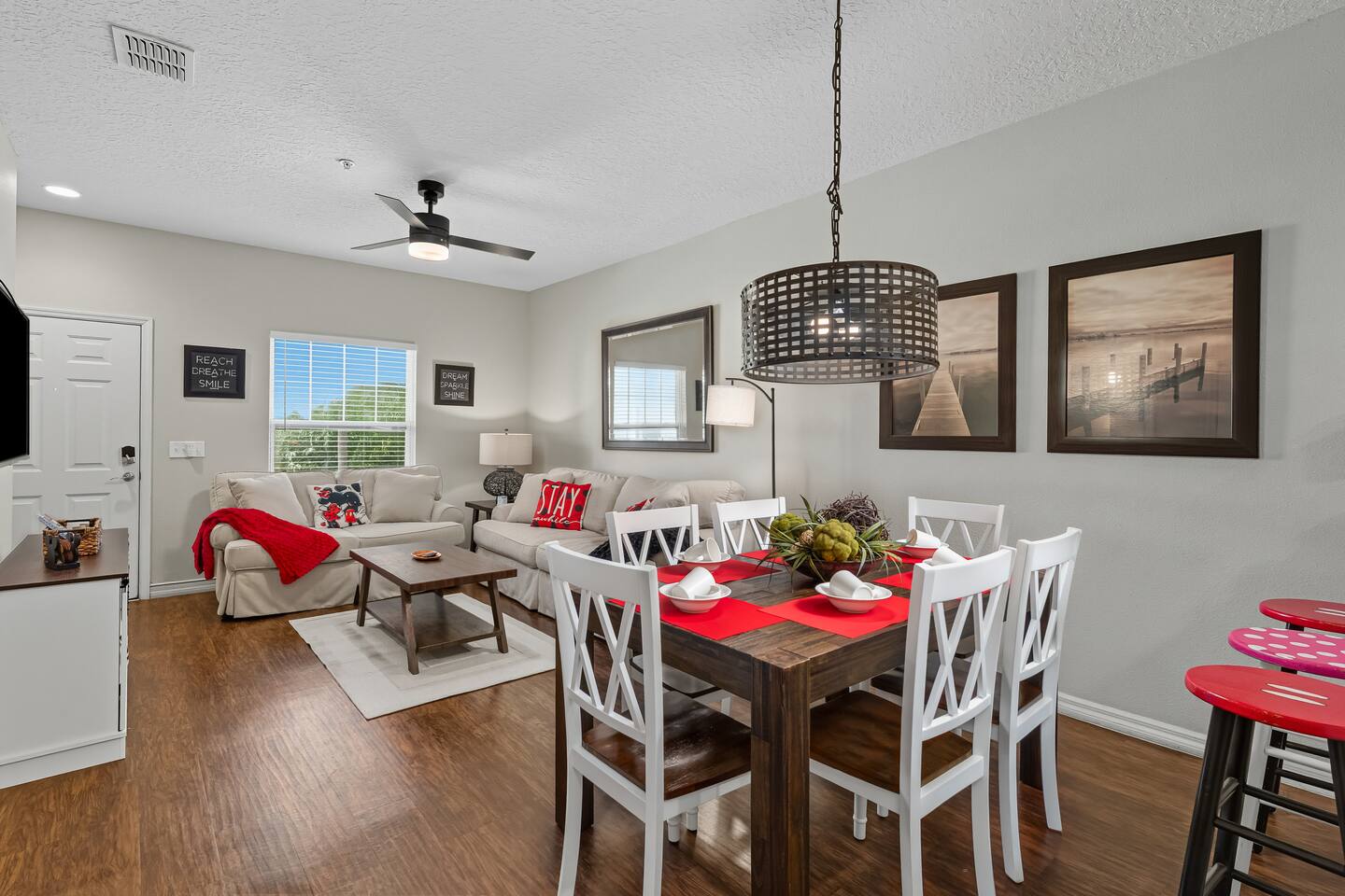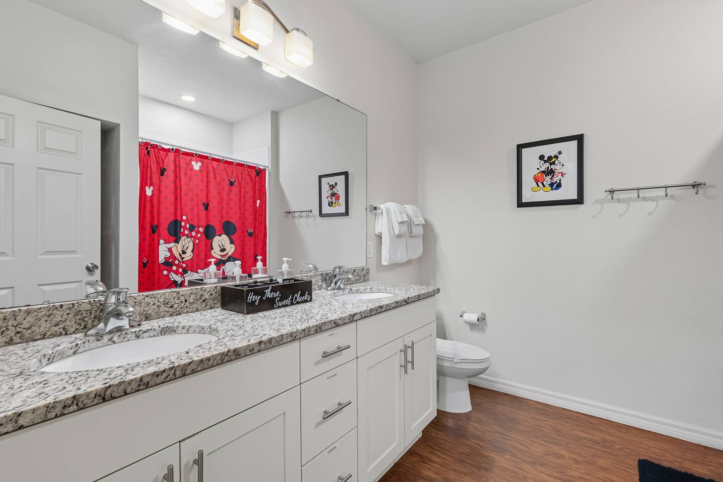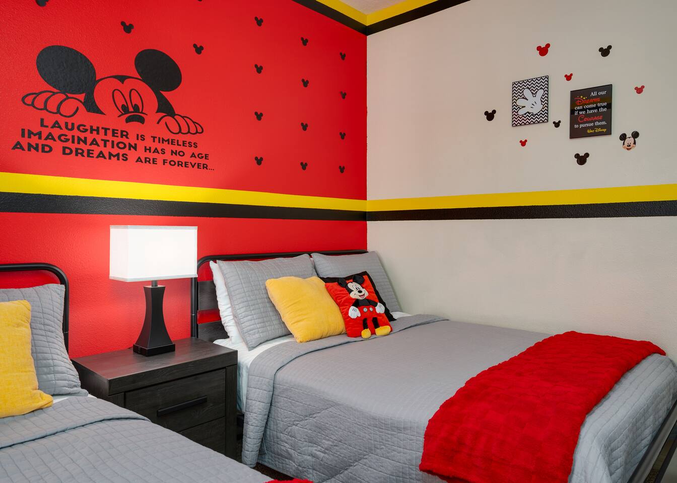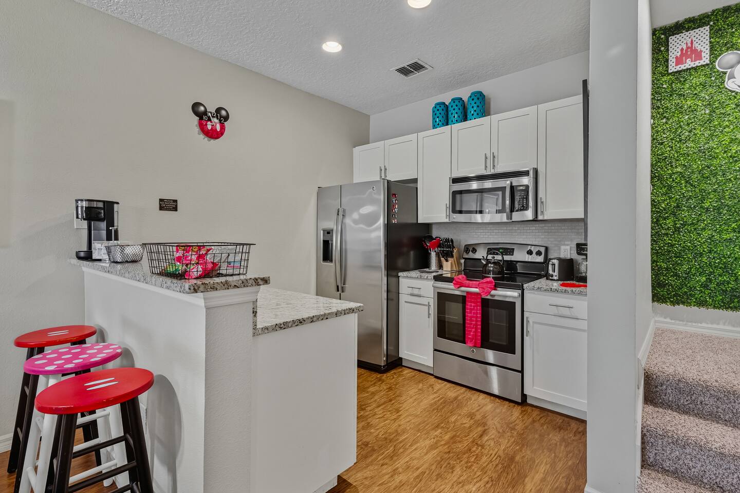⭐️YOUR VACATION HOME⭐️ ✔️Kid-imagined Mickey themed rooms and bathroom ✔️Free High Speed WiFi | Streaming Access ✔️Fully equipped kitchen with kid-friendly dinnerware ✔️Close proximity to all Orlando area attractions ✔️Gated community w/24Hr onsite security | Private keyless entry guest access code | Free onsite parking ⭐️KITCHEN⭐️ -Stocked kitchen with items you need such as cookware, utensils, dinnerware, and small appliances to prepare family meals -Dining table that seats 6, barstools for additional seating ⭐️LIVING AREA⭐️ -Smart HD TV with available streaming services (Netflix, Disney+, HULU, Amazon Prime Video) -Couch, LoveSeat, Sleeper Sofa pullout ⭐️BEDROOMS/BATHROOMS⭐️ -Three bedrooms (2 king sized beds, 2 double beds) that can accommodate up to 8 people comfortably -Two FULL Bathrooms -Smart HD TVs and ceiling fans in all bedrooms ⭐️WHAT WE PROVIDE⭐️ -Free WiFi and access to streaming services on all TVs in the home -Washer and dryer, A/C, Iron and Ironing Board, Hair dryers -Toilet paper, paper towels, garbage bags, sponges, dish soap, etc. -Shower gel, shampoo, conditioner, extra sets of bed linens and towels -BABY ITEMS: High Chair, Pack N Play, Stroller, Stair Gates -Free Onsite Parking and access to all resort community amenities ⭐️COMMUNITY FEATURES⭐️ Lucaya Village is a gated, resort community with 24 Hr security. Guests will have access to enjoy all of the amenities including a clubhouse, zero entry pool and hot tub, fitness center, kids’ playground, BBQ area, volleyball court, a Marvel themed playroom for the kids and more. The Clubhouse has a bakery and café and provides concierge services such as transportation and theme park ticket purchases. There is also a full service business center with computers, printers and high speed internet. ⭐️NEARBY POPULAR DESTINATIONS⭐️ WALT DISNEY WORLD (5-9 miles): Animal Kingdom, Magic Kingdom, Epcot, Typhoon Lagoon Water Park UNIVERSAL STUDIOS (approx. 15 miles): Islands of Adventures, Volcano Bay, Wizarding World of Harry Potter, Citywalk Orlando ORLANDO ATTRACTIONS (approx. 10 miles): Aquatica Orlando, SeaWorld Orlando, Discovery Cove, WonderWorks Orlando, Andretti Indoor Karting & Games GOLFING: Falcon's Fire Golf Course (2.5 miles), Celebration Golf Club (4 miles) AIRPORT: Orlando International Airport (22 miles)